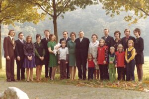 Willem Koebrugge en Riek Breukers met nakomelingen en hun huwelijkspartners en met kleinkinderen bij hun 40 jarig huwelijk in 1973 (fotogenomen bij kasteel Weldam).