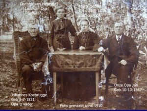 Johannes Koebrugge (VIIc, gehuwd met Gezina Wernink) en zoon Jan (Viiic), gehuwd met Johanna Roetgerink) en jongste dochter van Johannes, Maria Gezina (VIIIf), gehuwd met Gerhardus Heesink) en een nichtje.