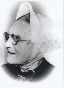 Mina Pierik, vrouw van Berend Jan Koebrugge (VIIIq). Mina werd op 38 jarige leeftijd weduwe en was toen nog in verwachting van zoon Jan. Ze was een van de laatsten uit Goor (waar ze woonde) die klederdracht droeg. De klederdracht werd vroeger in het hele Saksische gebied van Nederland gedragen (zie de kaart in het menu onder “Gebied”) . Op de foto heeft ze de knipmuts op, die werd op zon- en feestdagen gebruikt. Ze overleed op 94 jarige leeftijd en was dus 56 weduwe en bracht in haar eentje zeven kinderen groot.
